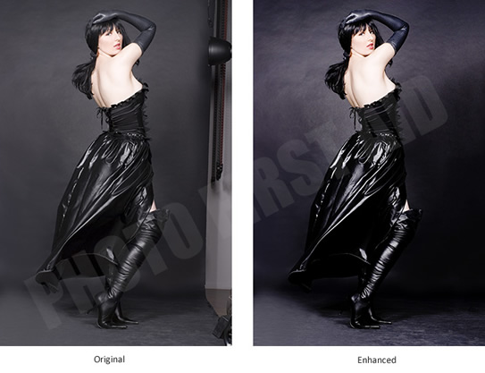 At first glance, the above photo looks like we have enhanced the image by cropping out the right edge of the studio, that would have been a quick fix but a poor one. We didn't do that as it would have made the picture unbalanced with the model too far to the right.