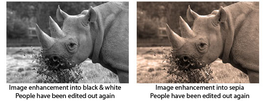 Colour photographs are great, but sometimes it takes a black and white, sepia or duo toned picture to really bring emotion into a picture. By turning the Rhino picture black and white, and also sepia, we remove a good snapshot and instantly the emphasis of the picture is on mood and texture.