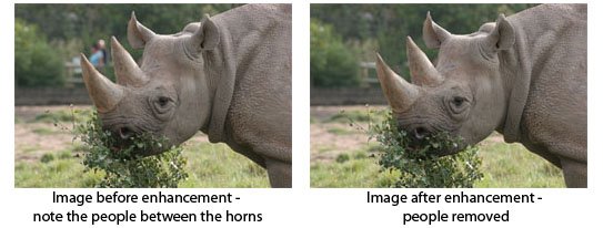 Another way we can enhance and enliven photographs is to remove and distracting background elements to the images. This Rhino is a prime example, it would be a great wildlife shot except for the brightly dressed people walking in the background. Through a little bit of airbrushing a Photo First Aid magic we can remove those people for a more natural picture