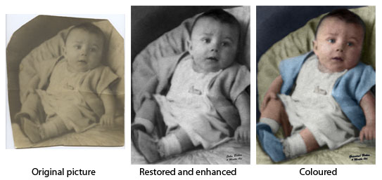 We have coloured black and white images giving a similar effect to the hand tinted photographs of the past. This can give a really special touch to a restoration for a loved one. We just request that you give us descriptions of the colours of hair, eyes and clothing and if possible back drop colouring. Anything you do not know or cannot remember we can work out with you to try to find a tint suitable to your taste and the rest of the colours within the image.