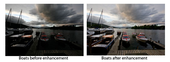We have enhanced the picture by correcting the underexposure whilst retaining the detail in the white of the boats and the clouds. This avoids any unsightly white 'voids' in the picture, the technical term for that is called burning out.